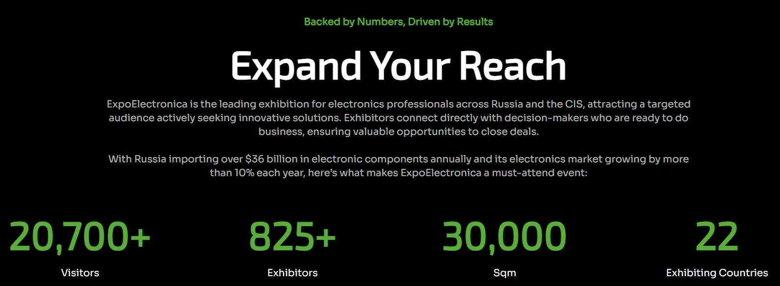 ExpoElectronica俄羅斯電子元器件展是俄羅斯和歐亞經濟聯盟最大的國際電子展覽會,展示了從組件制造到最終電子系統的開發和組裝的整個生產鏈。27年來,ExpoElectronica一直致力于推動俄羅斯電子產品的發展,是該行業的重要商業盛會。
