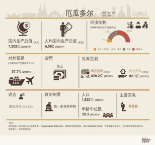 中國是厄瓜多爾第二大貿易伙伴,厄瓜多爾是中國在拉美第八大貿易伙伴。厄瓜多爾是中國的全面戰略伙伴,也是“一帶一路”共建國家。2023年厄瓜多爾國內生產總值1,202億美元,人均國內生產總值6582美元。世界貿易中商品貿易達620.2億美元。